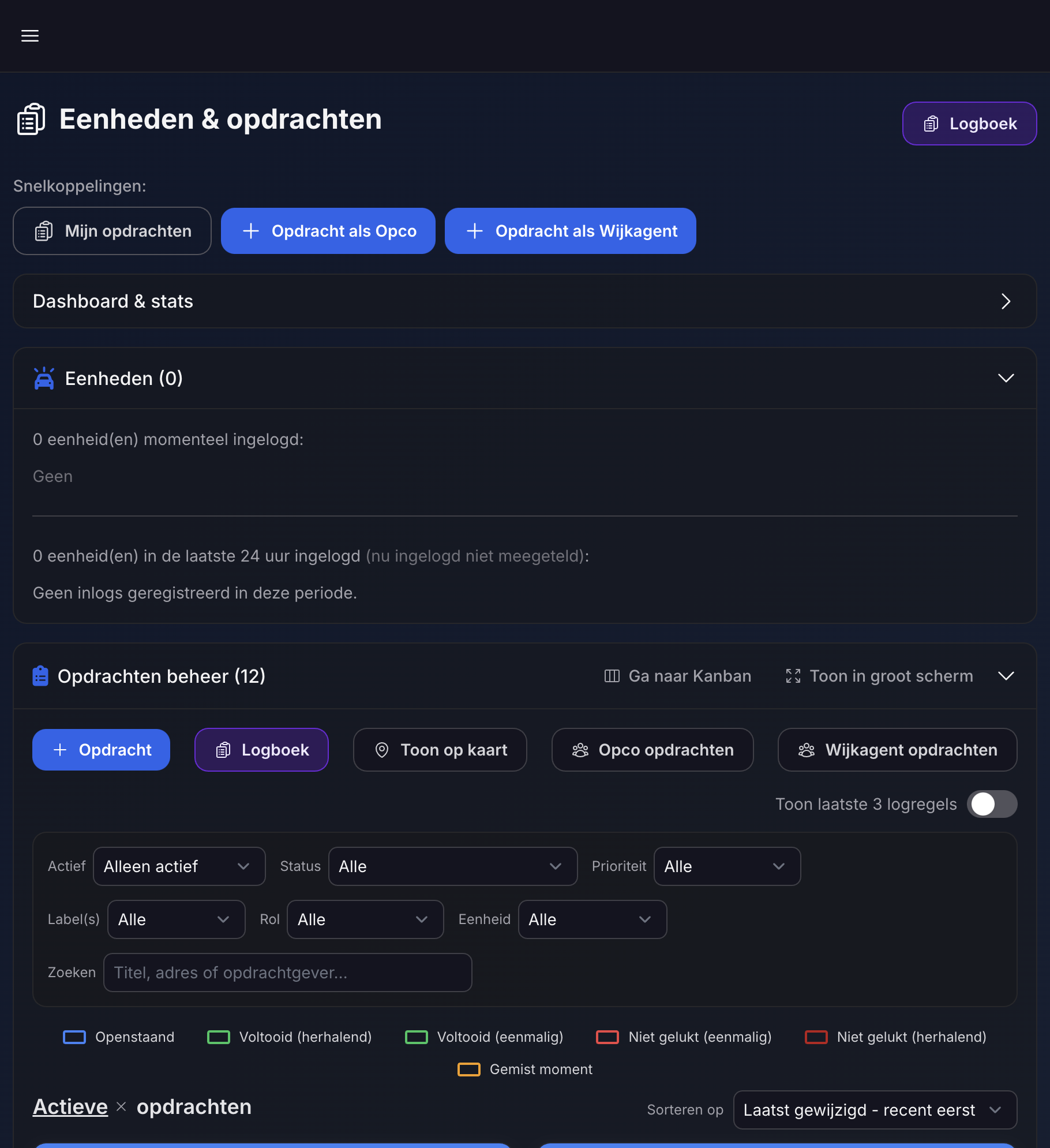 De screenshots hieronder komen uit een lokale installatie met demo-inhoud. Ze laten zien hoe eenheden, coördinatoren en schermen samen dezelfde operationele werkelijkheid delen.