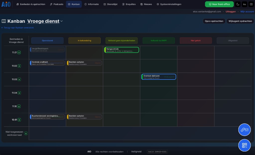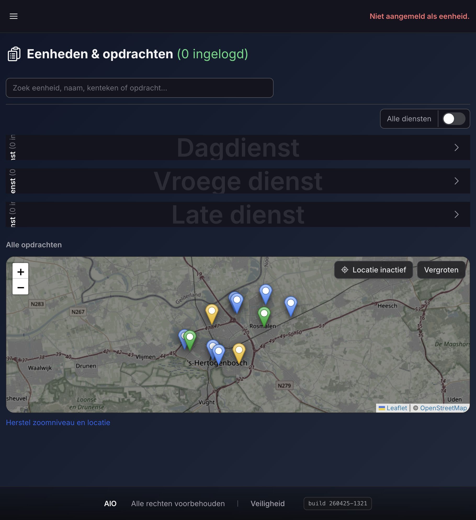 In AIO maakt de back-office opdrachten aan, koppelt ze aan eenheden of laat ze in de werkvoorraad staan, volgt statussen en ziet terug wat er is gebeurd. Eenheden werken in een duidelijke front-office: hun taken, relevante informatie, kaartlocaties en terugkoppeling zijn bereikbaar via het hoofdscherm, telefoon of tablet.