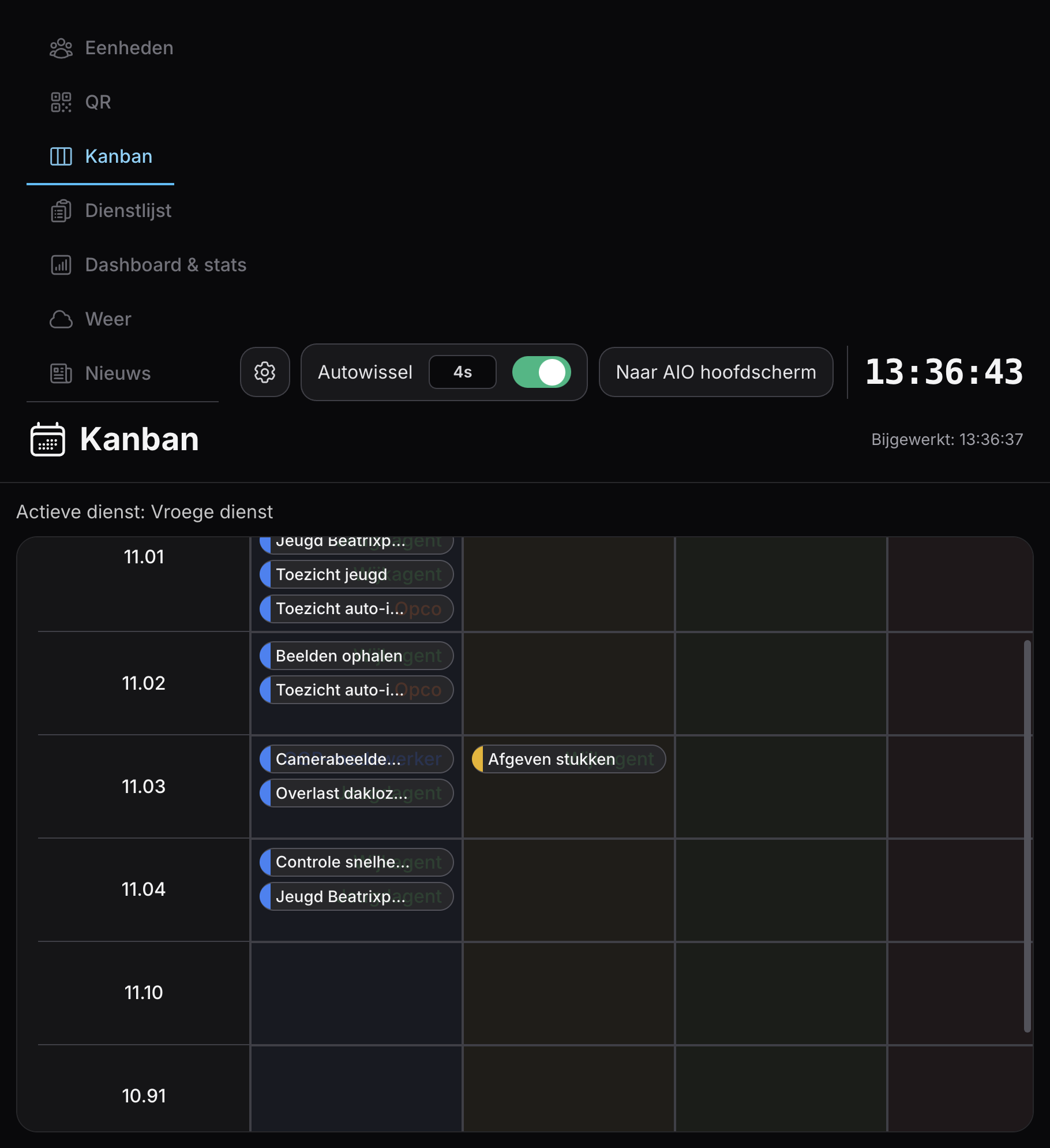 Toon Kanban, QR, dienstlijst, dashboard, weer of nieuws op een groot scherm.